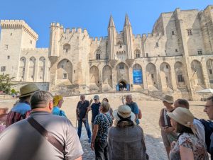 Doch der Reihe nach: Am Morgen des 7. August 2025 machten sich 22 FREUNDE VON CHÂTILLON, VONNAS UND BANEINS IN WÄCHTERSBACH zu einer achttägigen Reise in die Provence auf. Erster Zwischenhalt war LYON, wo die Wächtersbacher mit einigen Freunden aus Châtillon und Vonnas zu einem gemeinsamen Abendessen auf einem der schönsten Plätze Lyons, dem Place des Célestins, verabredet waren und einen wunderbaren Abend verbrachten. Am nächsten Tag ging die Fahrt weiter nach AVIGNON, wo selbstverständlich die berühmte Brücke und der Papstpalast besichtigt wurden, und danach weiter nach ST.REMY-DE-PROVENCE, wo die Freunde in einem Hotel zwischen Olivenhainen für 6 Tage ihr Quartier aufschlugen. St.Remy, Hauptstadt der Alpilles und eine der ältestens Städte Frankreichs, steht für Kunst, Kultur, Märkte, provencalische Lebensart und magisches Licht, welches viele Künstler angezogen hat, so auch Vincent van Gogh. Neben der römischen Ausgrabungsstätte Glanum kann man hier auch im ehemaligen Kloster St. Paul de Mausole die psychiatrische Klinik sehen, in der Vincent van Gogh 1 Jahr in Behandlung war.
